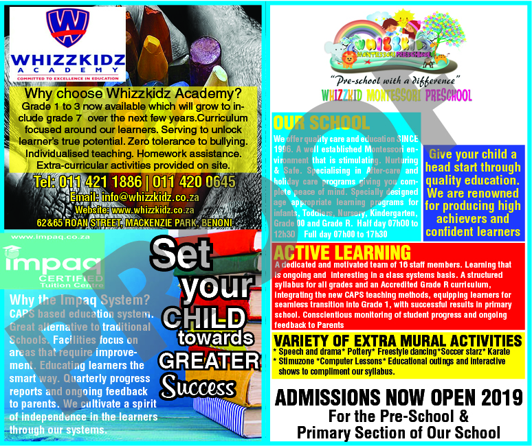 You as a parent remain the main educator of your child. Together with us as teachers, we can form a partnership wherein your child can develop. To achieve this, you as the parent must be involved with your child and be interested in his/her joys and sorrows. We as the school will support you and help you turn your child into a Whizzkid.